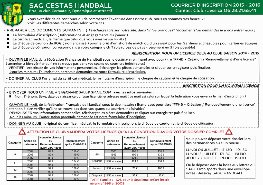 CI dessous, le courrier d'inscription qui vous aidera dans votre démarche d'inscription. Attention votre inscription informatique ne suffit pas pour que votre licence soit établie. Nous la validerons, que lorsque nous aurons votre dossier complet.